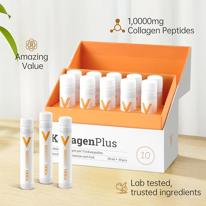 - ✅ VIKKI Beauty Collagen Drink: Our liquid collagen for women is produced in Germany with Marine Hydrolysiertes Collagen Peptides 10000mg/25ml + Hyaluronic 30mg+Vitamin C & E helps relax and relieve anxiety, thereby improving sleep quality.