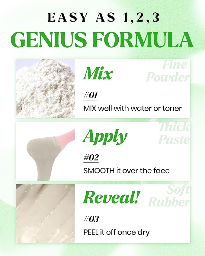 - EASY AS 1,2,3! Mix powder and water 1:1 in a mini bowl (1 spoon covers your face). Spread evenly with the spatula, applying a thicker edge for easy peeling. Leave on for 15–20 mins, peel off, and wipe residue with a cotton pad. Finish with moisturizer. 40 uses per 2.2 lb package!