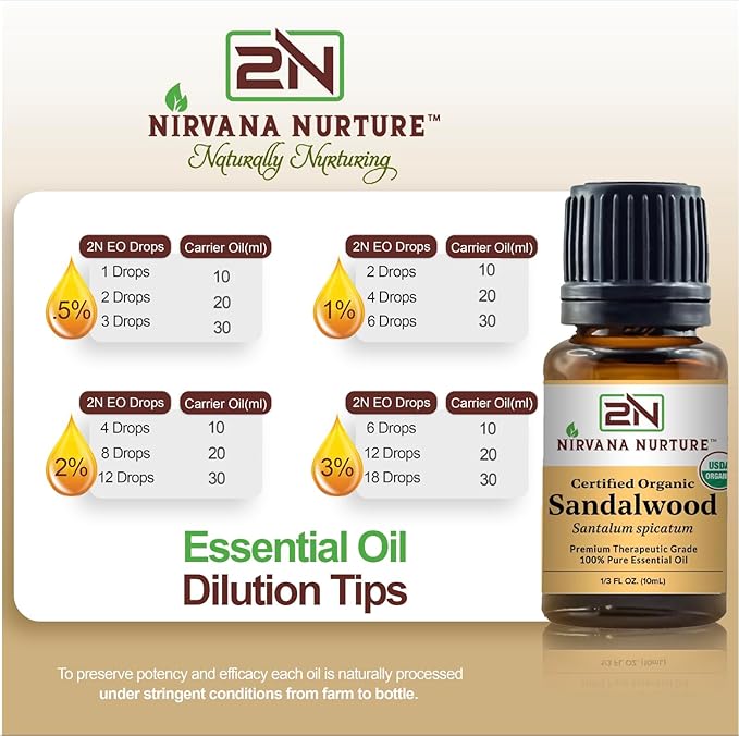 - CALM & RELAX: Nirvana Nurture Sandalwood oil is used for calming and relaxation by diluting 3-4 drops of oil in your chosen carrier oil to gently massage, or by adding 8-10 drops into bath water to help to sleep and relax.