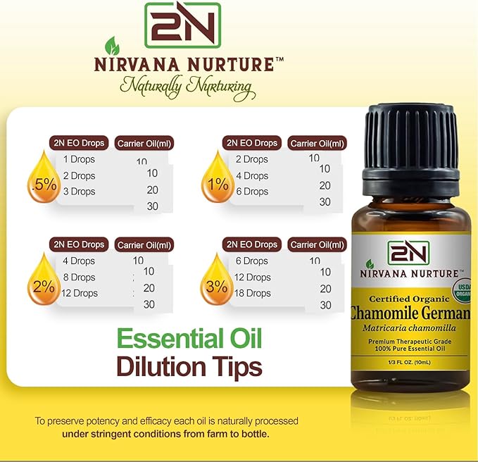 - CALM & RELAX: Nirvana Nurture Chamomile oil is used for calming and relaxation by diluting 3-4 drops of oil in your chosen carrier oil to gently massage, or by adding 8-10 drops into bath water to help to sleep and relax.