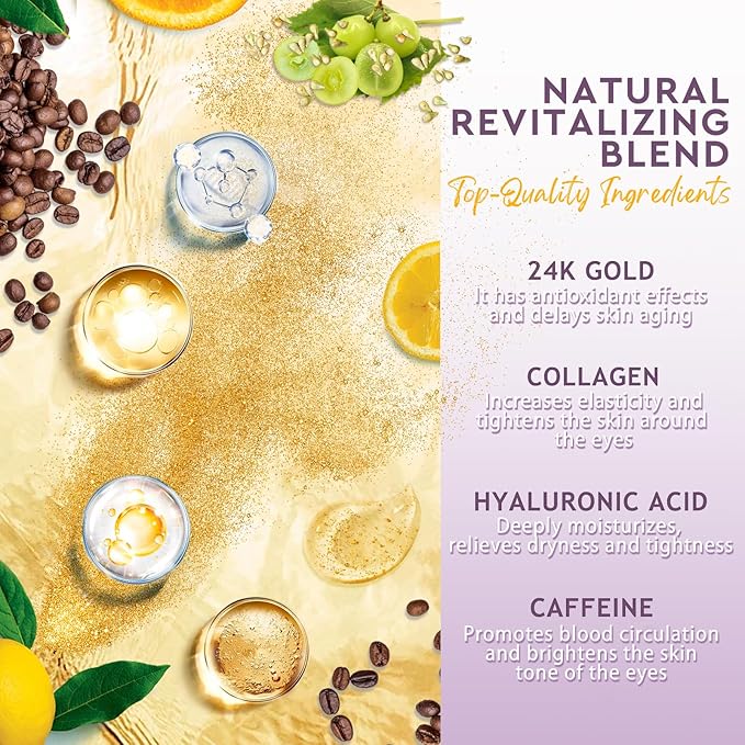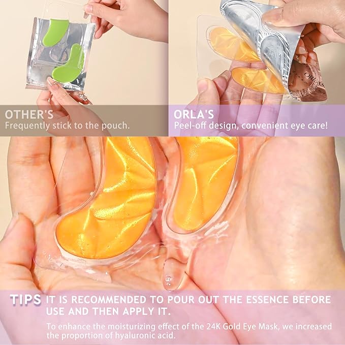 - [Effective Eye Mask]: The ingredients of ORLASKIN eye mask are rich in 24k gold nanopowder, which can stimulate the production of collagen. It is specially designed to target dark circles, puffy eyes, dullness around the eyes, eye bags, and eye wrinkles. It can also accelerate cells and collagen. Protein regeneration improves the skin texture and texture of the eye area, deeply moisturizes the area under the eyes, and enhances skin elasticity.