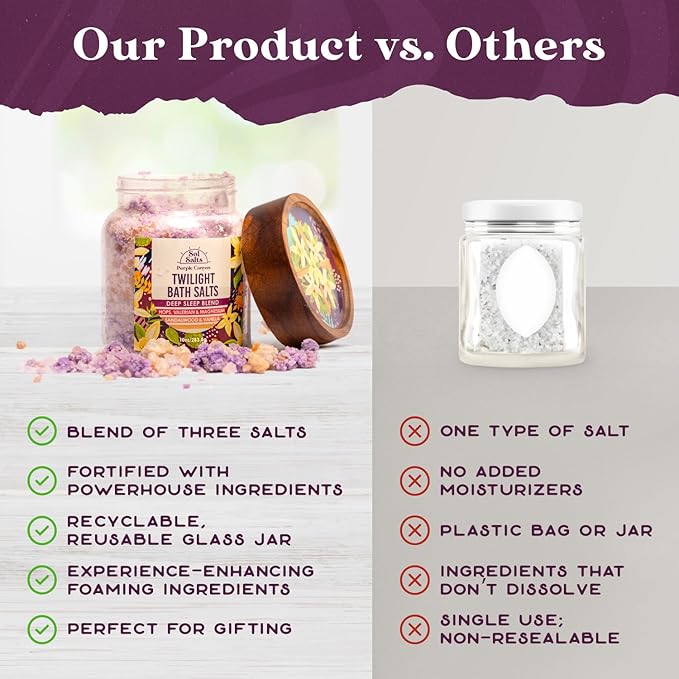 - ๐๐ซ๐ข๐๐ญ ๐ข๐ง๐ญ๐จ ๐๐๐๐ฉ ๐๐ฅ๐๐๐ฉ: Experience tranquility with Purple Canyon SolSalts Twilight Bath Salts. Crafted with a blend of Valerian Root Extract, Hops Extract, and Magnesium, this bath salt blend promotes relaxation and enhances sleep quality, helping you drift into a deep and restful slumber. Indulge in the ultimate bath-time ritual with our premium salt blend creating a spa-like experience at home.