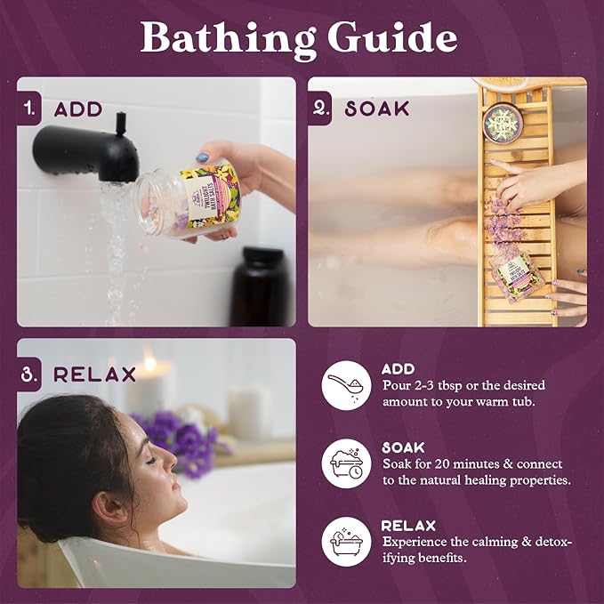 - ๐๐ง๐ข๐ช๐ฎ๐ ๐๐๐ญ๐จ๐ฑ๐ข๐๐ฒ๐ข๐ง๐ ๐๐ข๐ง๐๐ซ๐๐ฅ๐ฌ: Our Twilight Bath Salts feature hand-processed purple crumbles that act like mini bath bombs, releasing a natural foaming agent and a soothing Sandalwood and Vanilla scent for an enhanced deep sleep experience. Enriched with Magnesium and Deep Sleep Minerals, they help you drift into a restful slumber.