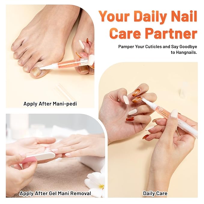 - 【Easy To Use】 - For first time use, keep clockwise twisting the grip of the nail polish tube and wait for 1-2 minutes until the polish drips off.Brush the oils onto your cuticles and the surrounding skin.Gently massage,3-4 times a week.Note: Cover the cap after use.