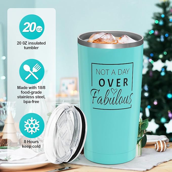- [THOUGHTFUL PACKAGING LIST] Our well-designed box contains an eye mask, a 20 oz. stainless steel insulated mug with the stylish words "Not A Day Over Fabulous" along with a straw and cleaning brush, a bar of Pure Diamonds Lavender Handmade Soap, a bath bomb, bath salts, a wax-scented candle, and a bath brush, as well as a greeting card with your special message.