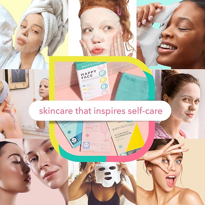 Patchology Face Mask Variety Pack - Brightening Face Mask with Vitamin C stimulates collagen, Hydrating Face Masks with Hyaluronic Acid soften skin, Renewing Face Masks with Strawberry (6 Masks)