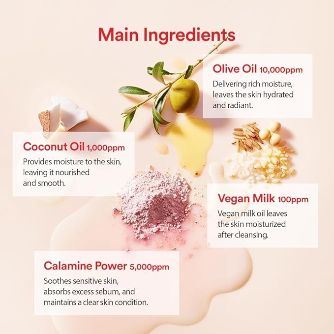 - KEY INGREDIENTS FOR CLEARER SKIN: Formulated with 5,000ppm of calamine powder to absorb excess oil and purify pores, along with 10,000ppm olive oil and 1,000ppm coconut oil to deeply moisturize the skin. Vegan white milk complex, made from rice, oat, and soy, soothes and nourishes without irritation.