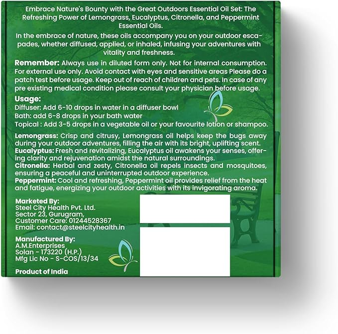 - Invigorating Scents for Freshness and Energy – Eucalyptus and Peppermint oils bring refreshing, uplifting aromas that energize your senses, helping you stay revitalized during outdoor activities. Ideal for summer days or anytime you want a cool, refreshing environment.