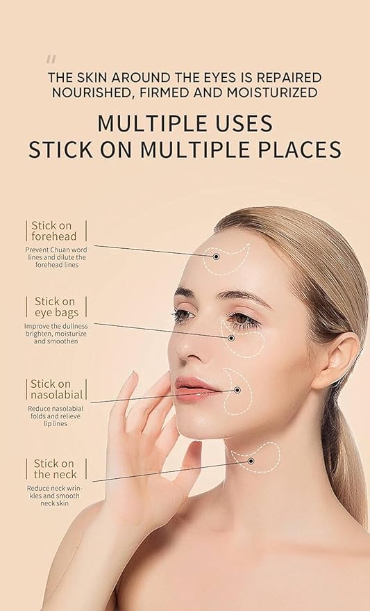 - π Extra Usage Tip: You can also apply the Hydrogel Patches at the neck, around the mouth & forehead as an anti-wrinkle and dryness solution since they will adhere to any part you apply them to allow the skin to absorb all the ingredients targeting the wish area and obtaining the same benefits listed above.