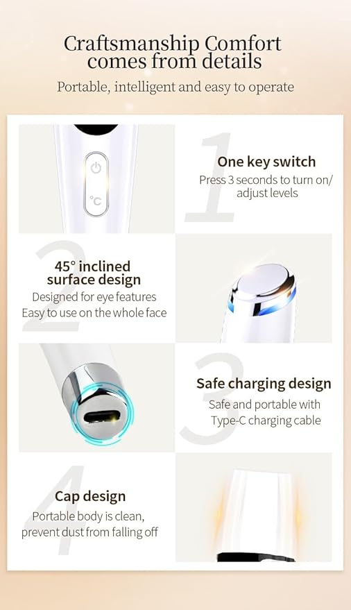 - 3.Safe and Easy to Use: Our Eye Massage Wand is equipped with a timing function that automatically turns off after 5 minutes, ensuring your skin won't be harmed if you forget the time. It is also effortless to operate, simply press and hold the power button for 2 seconds to start the machine and switch between function modes with a single press.