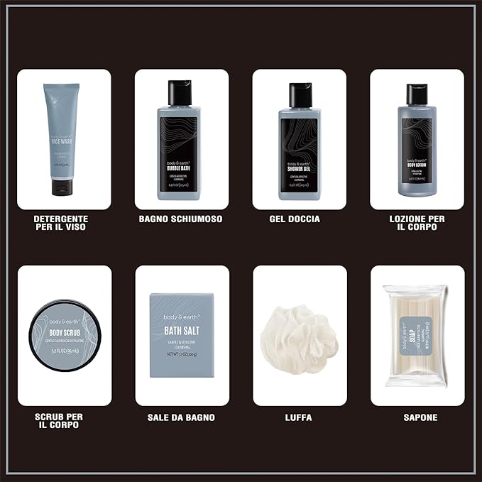 - Gift Baskets for Men:Includes shower gel, bubble bath, face wash, body lotion, body scrub, bath salt, soap, and a loofah. Each item cleanses, nourishes, exfoliates, and scents your skin with a distinguished leather fragrance.