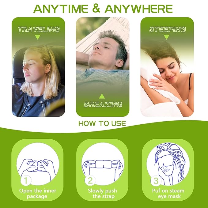 - 【Green Tea Scented Self-Heated Eye Mask】: Relieve eye fatigue, moisturize eyes, and improve sleep quality with our steam eye masks.Reduce puffiness, dark circles, and dryness in just 30 minutes.