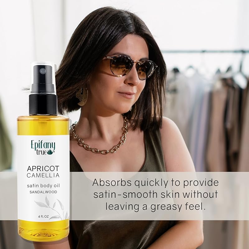 - BODY OIL: Nourish skin with 4oz Apricot and Camellia Satin Body Oil. Abundant in Vitamins A & E Apricot Kernal Oil is known to help in slowing the aging appearance of skin. Use this Apricot blend body oil to help in toning skin, maintaining elasticity, suppleness and firmness. Excellent spray mist dispenser.