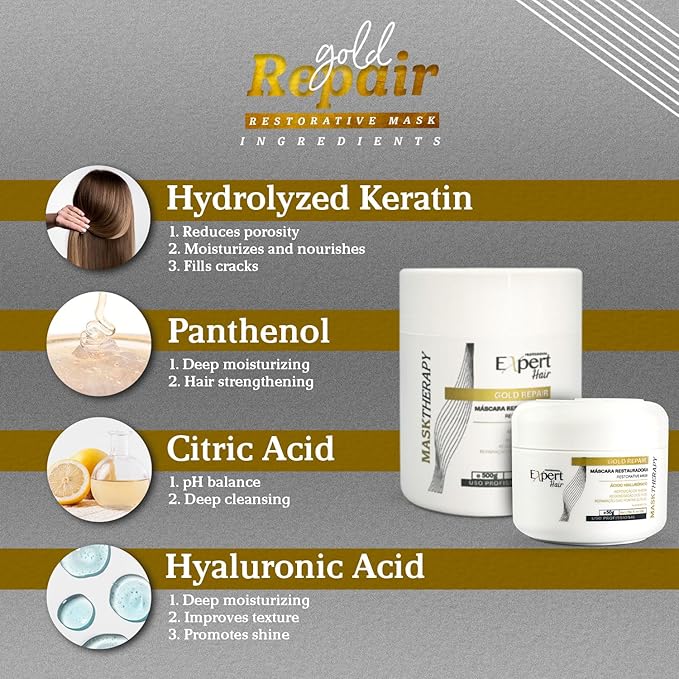 - POWERFUL REPAIR AND INTENSE HYDRATION – The Gold Repair Mask, infused with hyaluronic acid and amino acids, restores softness and locks in moisture, sealing cuticles for a luxurious, salon-quality finish.