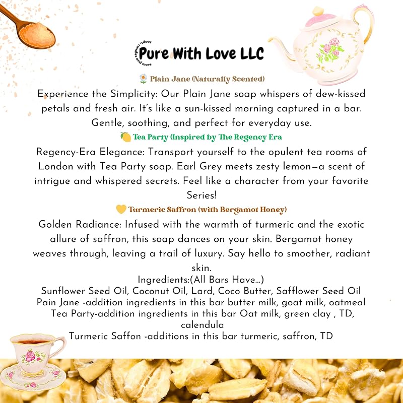 - HONEST INGREDIENTS- 100% HANDMADE Sunflower seed oil , coconut oil , lard , safflower seed oil , coco butter , clay , goat milk , yogurt fragrance oil Each bar is unique see packaging for each bar ingredients