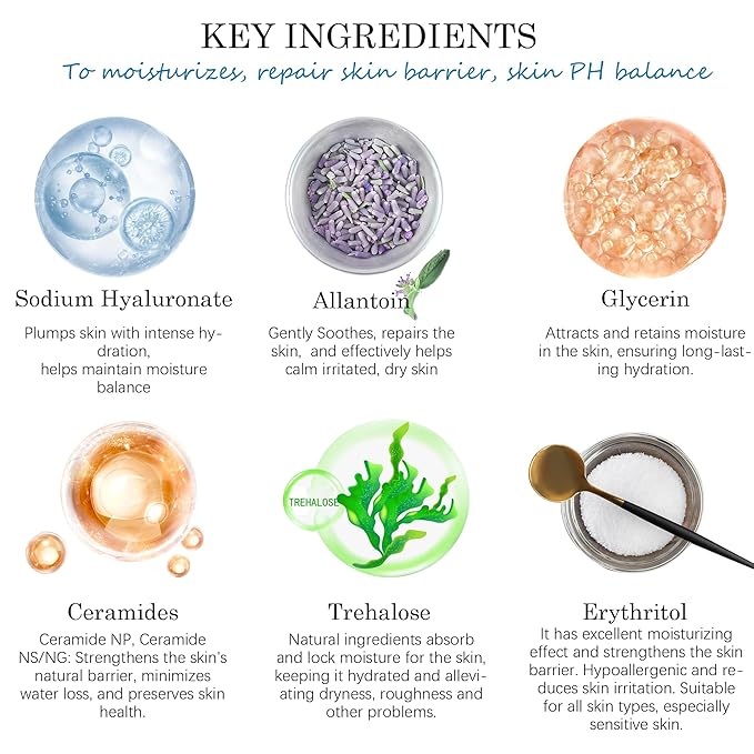 - Special Ingredients : Sodium hyaluronate, ceramides, allantoin, glycerin and amino acids.