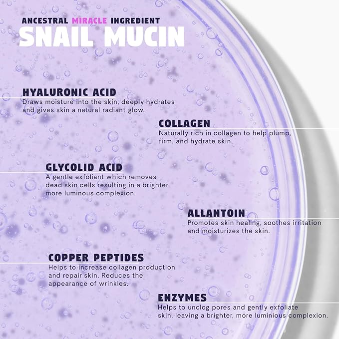 - Special Ingredients : Hyaluronic Acid, Glycolic Acid, Collagen, Ectoin, 97% Snail Secretion Filtrate