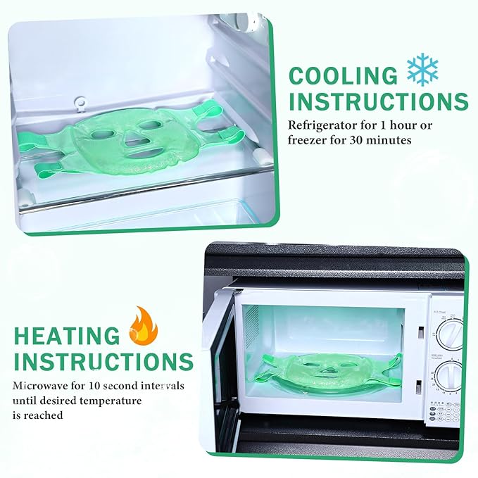- Unparalleled Ease of Use: face Ice Mask and Eye Ice Pack are designed for your convenience; They can be applied alternately on eyes or face, providing maximum flexibility; Store them in a refrigerator at -18℃ or below for at least 2 hours for a cold compress or heat in a microwave in 10-15 second increments until desired temperature is reached, with a maximum heating time of no more than 30 seconds for gel face mask and 20 seconds for gel eye mask