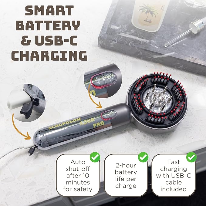 - 🪮 Extended 4-Hour Battery Life: The ScalpGlow Aqua Pro is equipped with a powerful battery that provides up to 4 hours of continuous use on a single charge. Perfect for multiple sessions, this long-lasting battery ensures that your scalp care routine is uninterrupted, even on the go.