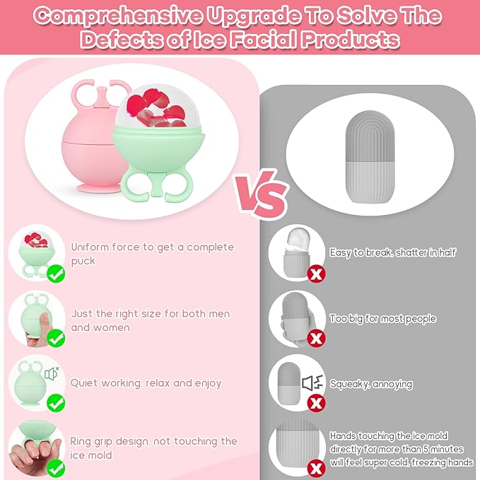 - USE UPGRADE: Compared to other ice face roller they problem point is that the size is big to use the feeling is not good, after turning into ice is difficult to open, open also often segmented into 2 halves can not be used, difficult to clean and so on.Our new ice facial sphere effectively solve these problems, the size of the right size,spherical curved surface so that it is easy to open,there will be no section into 2 sections of the situation,cleaning is also very easy and convenient