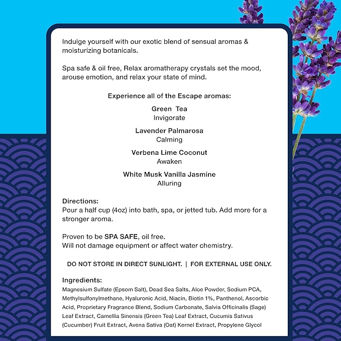 - SKIN-SOFTENING MOISTURIZERS: Infused with nourishing moisturizers, these hot tub spa aromatherapy salts hydrate and rejuvenate your skin, making them ideal for use in spas, hot tubs, and whirlpool baths.