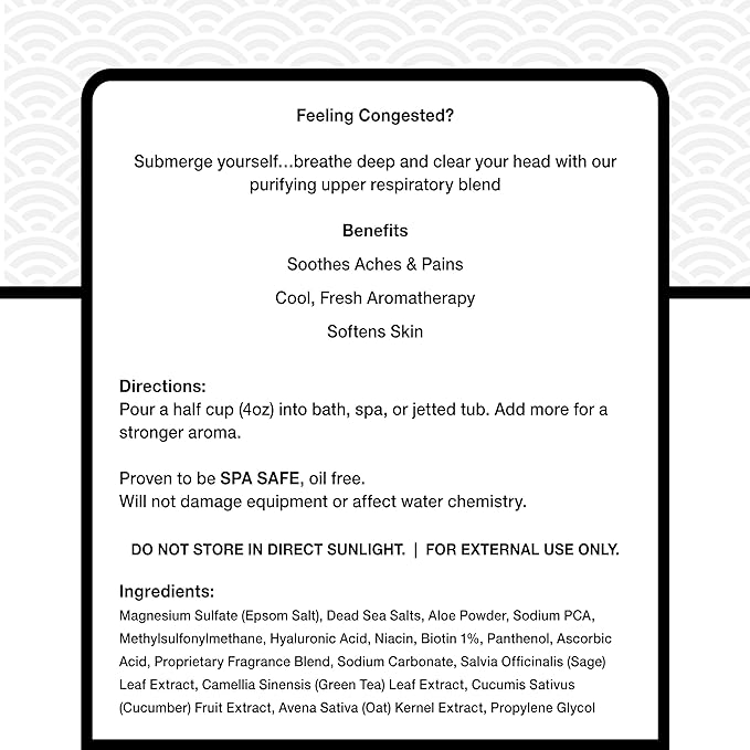 - RESPIRATORY WELLNESS SUPPORT: Immerse yourself in a relaxing bath designed to encourage easy breathing with a soothing blend of epsom salt and Dead Sea salt for soaking that help create a calming, revitalizing experience.