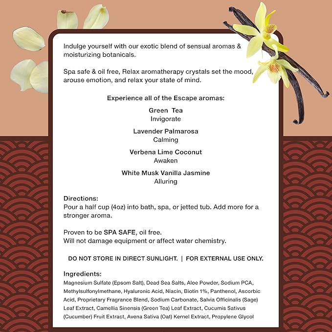 - SAFE FOR SPA USE WITH SECURE SEAL: Developed to maintain the water chemistry of your spa, our bath crystals won’t clog filters or harm surfaces, ensuring your equipment remains in pristine condition. In addition, designed for convenience, our PRESS-LOK closure provides a secure, intuitive seal—simply press to lock for an airtight, spill-resistant, and effortless storage solution.