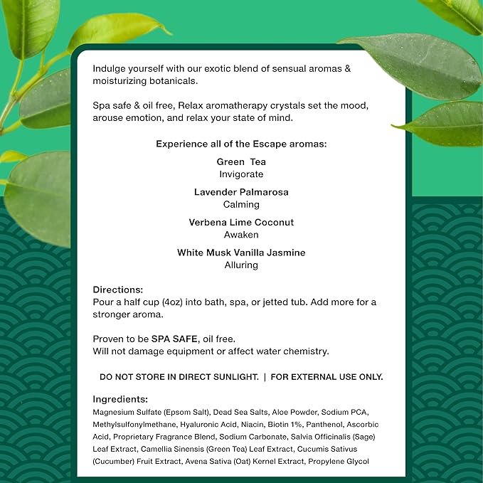 - SAFE FOR HOME & SPA USE WITH SECURE SEAL: Gentle on pH levels and compatible with all spa and hot tub systems, this hot tub spa aromatherapy soak will not clog filters, damage equipment, or stain surfaces. Enjoy the versatility of a bath soak that can be used safely in various settings. In addition, designed for convenience, our PRESS-LOK closure provides a secure, intuitive seal—simply press to lock for an airtight, spill-resistant, and effortless storage solution.