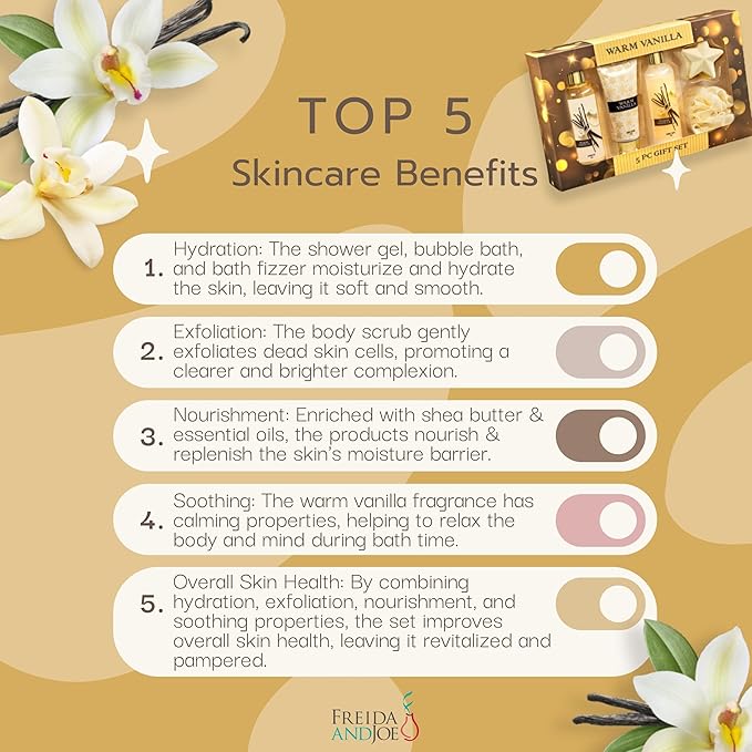- Warm and comforting vanilla fragrance bath set are the best gift idea for Easter, Mother's Day, Birthday, Anniversary, Wedding, Christmas, Holiday, teachers, perfect for women all ages, gift for mom.