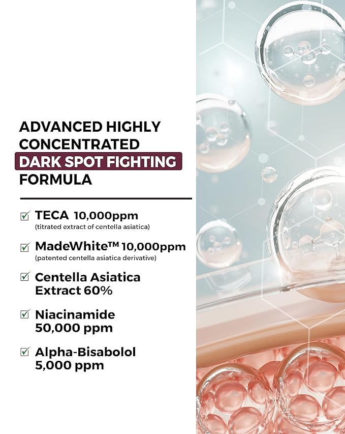 - HIGHLY CONCENTRATED - Each bottle is formulated with a highly concentrated dark spot-treating ampoule containing 10,000 ppm of TECA (titrated extract of centella asiatica), the core ingredient of Dongkook Pharmaceutical's technology, 10,000 ppm of MadeWhite, and a patented ingredient derived from centella asiatica.