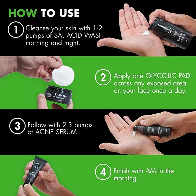 - Enhance Your Handsome: The TiegeClear Acne Advanced Routine is a comprehensive skin care regimen designed to combat acne. The system includes SAL ACID WASH (2.5 oz), GLYCOLIC PADS (30 count), ACNE SERUM (0.85 oz), and AM Moisturizer (0.75 oz). The products in this routine are designed to work together using TiegeClear technology to prevent breakouts and acne, and moisturize your skin. This set provides a 30-day supply that’s great as a starter pack for you or a gift for someone else.