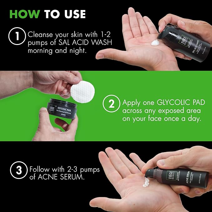 - Enhance Your Handsome: The TiegeClear Acne Essentials Routine is a comprehensive skin care regimen designed to target acne from all angles. The system includes SAL ACID WASH (2.5 oz), GLYCOLIC PADS (30 count), and ACNE SERUM (0.85 oz). The products in this routine are designed to work together using TiegeClear technology to prevent breakouts and acne. This set provides a 30-day supply that’s great as a starter pack for you or a gift for someone else.