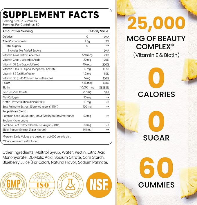 - Biotin 10,000 mcg & Collagen Gummies: Our premium biotin gummies deliver 10,000 mcg of biotin to support hair growth, combined with collagen, keratin, and saw palmetto to help maintain healthy hair, skin, and nails. This hair skin and nails vitamins designed to complement your routine