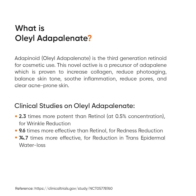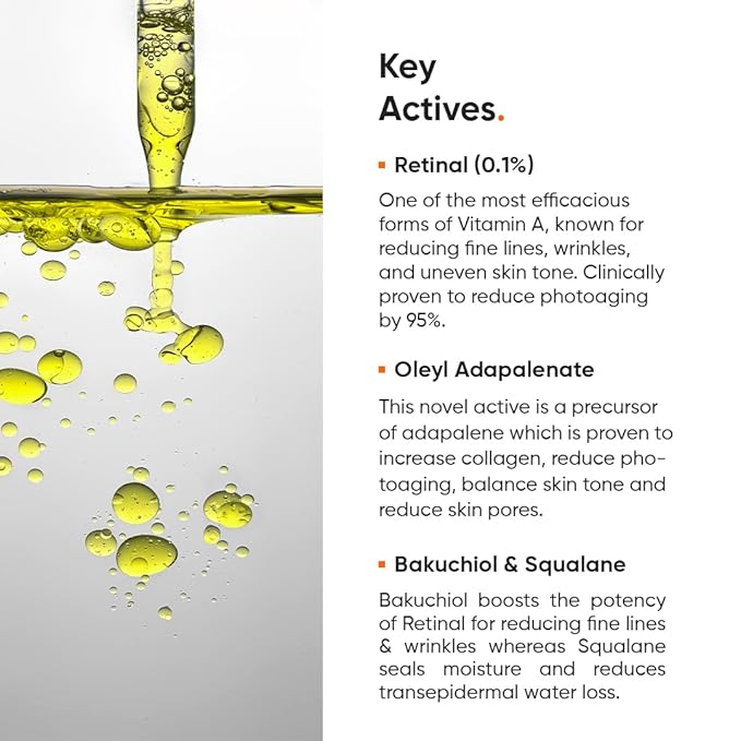 - [ ADVANCED INGREDIENTS ]: Formulated with Retinal (a potent yet gentle form of Vitamin A), Oleyl Adapalenate (for wrinkle reduction), Bakuchiol (calming), and Squalane (for deep hydration and moisture retention). Each ingredient works synergistically to combat signs of aging and promote a smoother skin texture.