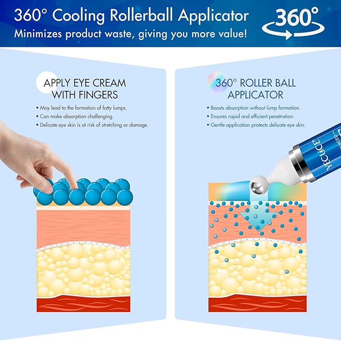 - 【360 Massage Roller Ball】: Our eye cream uses a stainless steel roller ball applicator to bring a cool and refreshing sensation, which helps to stimulate blood circulation around the eyes and enhance the absorption of active ingredients.