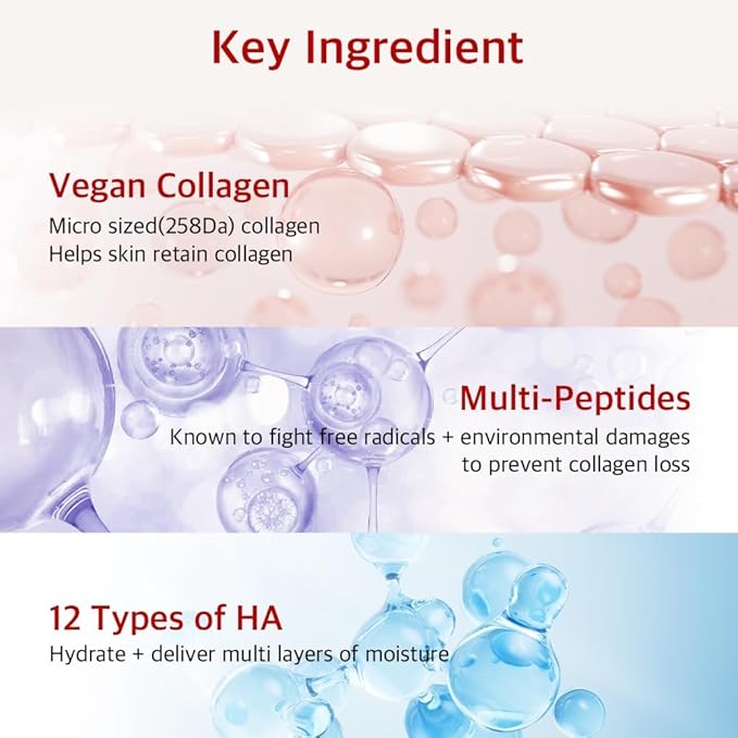 - [EXCLUSIVE COLLAGEN FLEX COMPLEX] Featuring micro-sized vegan collagen and patented multi peptides that enhance skin elasticity while protecting against collagen degradation caused by external circumstances like UV exposure.