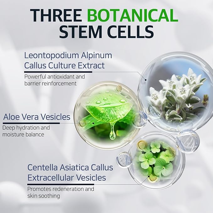 - [Plant-Based Stem Cell Blend] Edelweiss Callus, Aloe Vera Exosome, and Cica Exosome work together to regenerate the skin, delivering active ingredients deep into the skin through particles approximately 230 times smaller than pores for enhanced absorption and calming care.