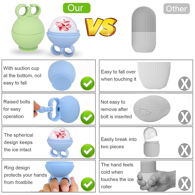 - Unique Finger Ring and Suction Cup Design: Different from the traditional ice roller, our ice face mold has a unique design. Hand ring design: protects your fingers from frostbite while in use, which is more ergonomic. The bottom suction cup design: the facial ice roller is placed more smoothly, which can prevent the face ice roller from being accidentally touched and tipping over causing water leakage.