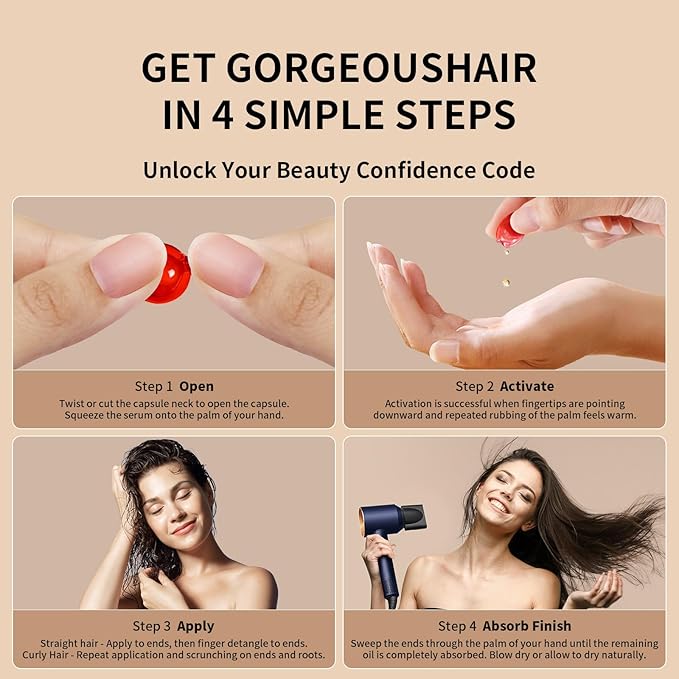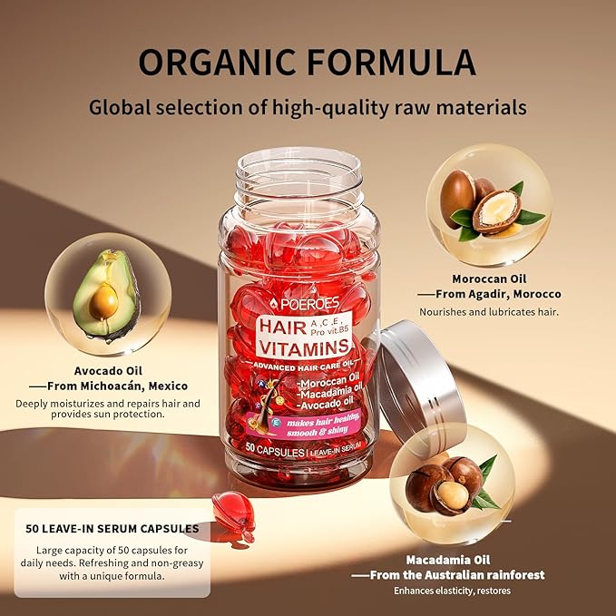 - Hair Nourishment: Hair vitamins with A, C, E, B5, and biotin, plus macadamia and avocado oils, for frizz-free, healthy hair.