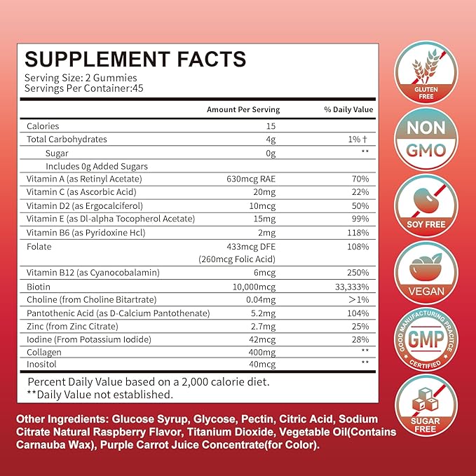 - SCIENTIFIC AND EFFECTIVE FORMULA - Our hair skin and nails vitamins gummies contain 10,000mcg of Biotin, 400mg of Collagen and contain Folic Acid, Pantothenic Acid, Zinc, Iodine, Vitamins A, C, D2, E, B6 and B12 which work synergistically to help replenish your body's daily requirements and rejuvenate your appearance and vitality from within, making it the ideal daily supplement for men & women.