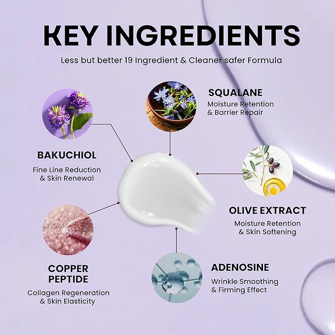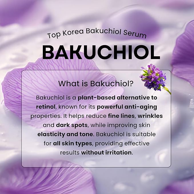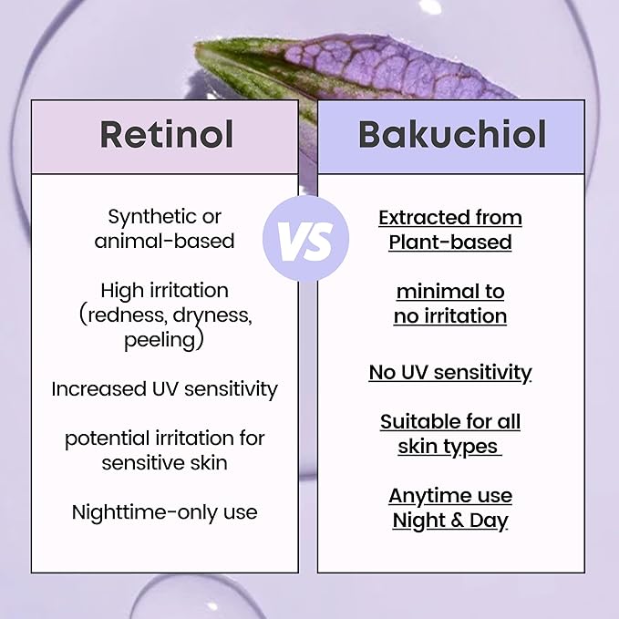 - BAKUCHIOL: GENTLE RETINOL ALTERNATIVE – Say goodbye to harsh retinol reactions with the power of Bakuchiol, a plant-based solution offering all the benefits of retinol without irritation. It effectively treats fine lines and wrinkles, boosts collagen, and firms your skin. Its renewing formula visibly smooths and resurfaces skin texture. Unlike retinol, it is not sensitive to sunlight, making it safe for both day and night use.