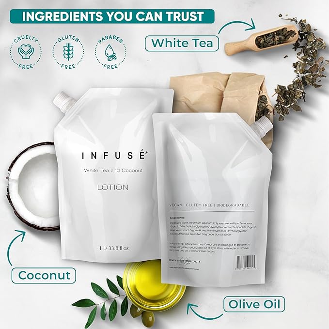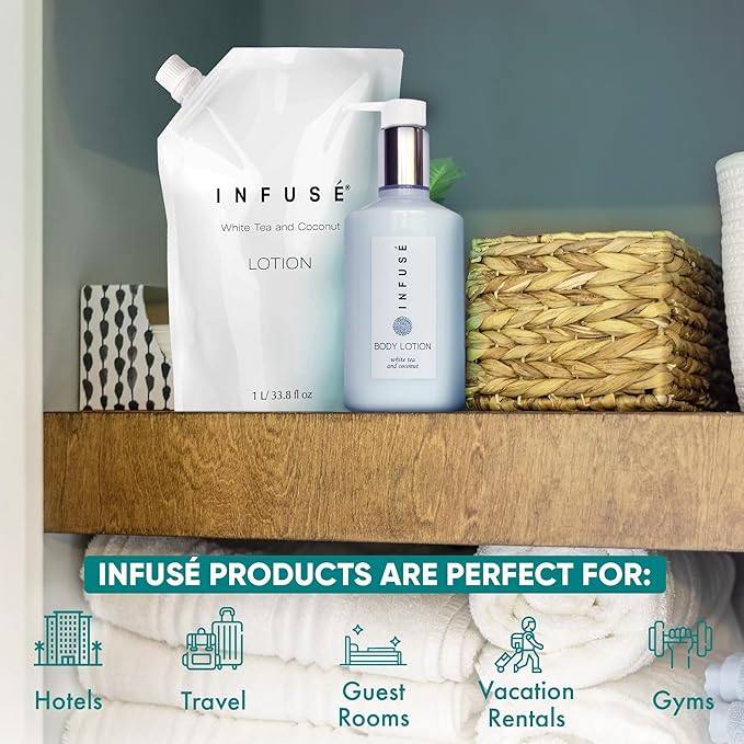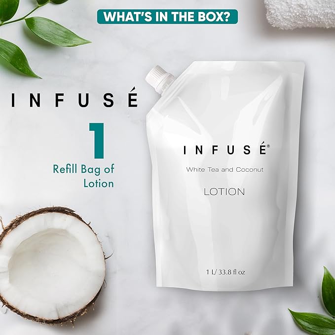 - HOTEL-QUALITY, LUXURIOUS AMENITIES: Enhance your guest experience with the Infuse White Tea and Coconut in a convenient 1-Liter Refill Bag, designed to refill wall-mounted and stand-alone dispensers. Enriched with white tea, coconut, organic aloe, and olive oil, this gentle, daily-use formula suits sensitive skin and hair. Ideal for hotels, vacation rentals, guest bathrooms, and homes, these premium amenities add sophistication and functionality to any hospitality space.