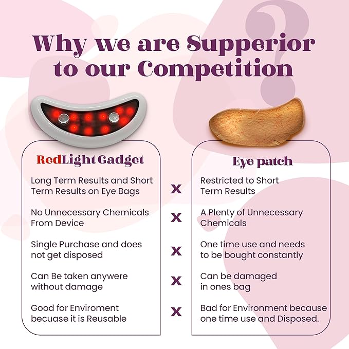 - No Long List of Chemicals Other Eye Bag Products Use an Extensive List of Chemicals. With Our Red Light Therapy Gadget There are No Chemicals Coming Out of the Device.