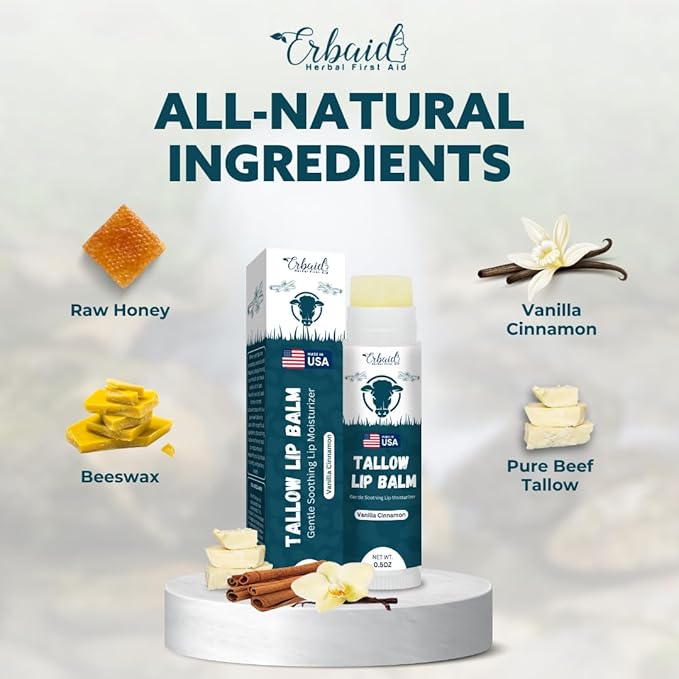 - INTENSELY HYDRATING FORMULA: Immerse your lips in moisture with our grass-fed organic beef tallow lip balm with vanilla cinnamon flavor. Crafted with natural fats, akin to those in human skin, it maintains your lips' moisture barrier for enduring hydration and velvety softness.