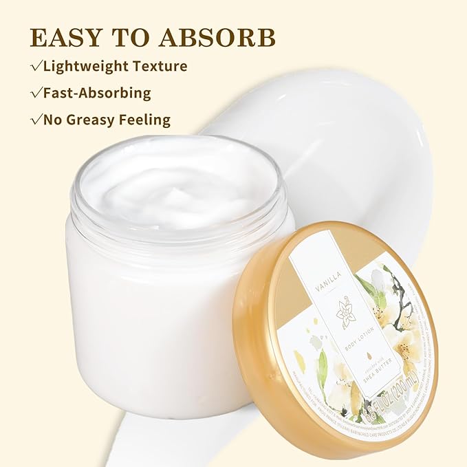 - 24-HOUR SUPER MOISTURIZING: Our Vanilla Body Lotion contains natural ingredients of Shea butter, which can deeply nourish and moisturize the skin, strengthen the skin barrier and replenish water, provide 24-hour strong moisturizing, and make the skin soft, smooth and natural.