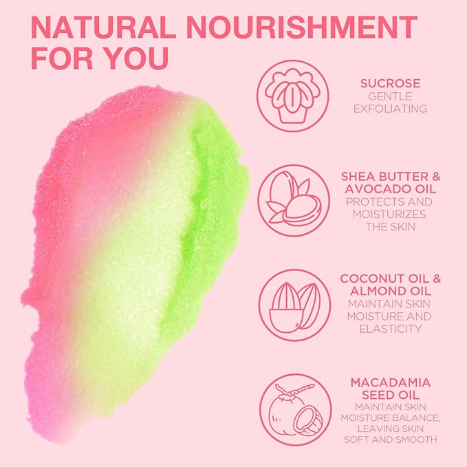 - NATURAL NOURISHMENT: Our Strawberry Body Scrub is enriched with natural nutrients such as Shea Butter, Coconut Oil, Vitamin E and Strawberry Extract, which can effectively penetrate the skin, remove impurities, deeply nourish, leaving skin burden-free, soft, smooth and youthful.
