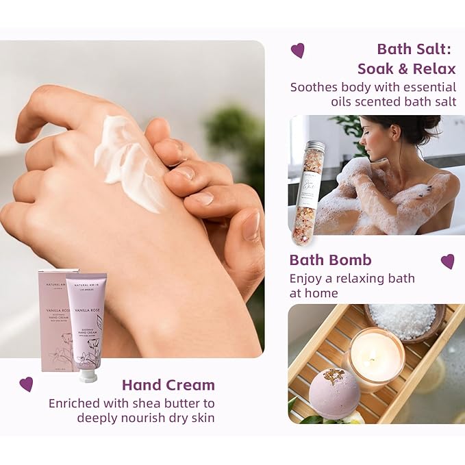 - Luxurious Spa at home experience :This 5 pcs gift box includes one 3.5oz Rose Natural Soap Bar, one 3oz rose geranium bath bomb, one 3.5oz Snow White Bath Salt, one 1.8oz vanilla rose hand cream and one soap saver
