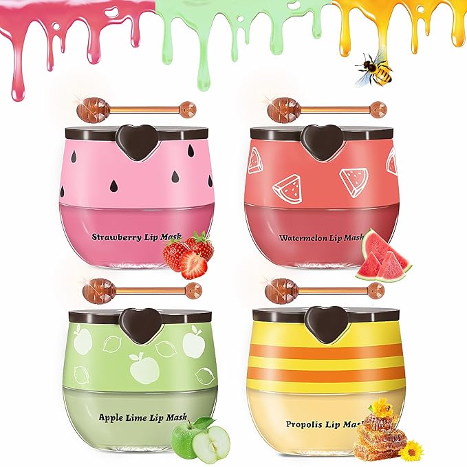 Bee Lip Balm Honey Pot, 4pcs Propolis Lip Mask Overnight Moisturizing Fruity Lip Balm with Stick, Hydrating Prevention Dry and Cracked Lip Scrubs Exfoliator Lip Care, Sleeping Lip Mask Hydrating(B#)