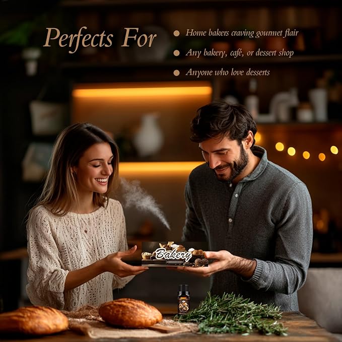 - 【Set Of 6 * 10ML Bakery Essential Oils】Irresistible Bakery Scents – Fill your home with the cozy warmth of Vanilla Bean, Cookies, Cinnamon Rolls, Cupcakes, Chocolate Crepes, and Bread. Perfect for holidays, relaxation, or nostalgic baking memories.