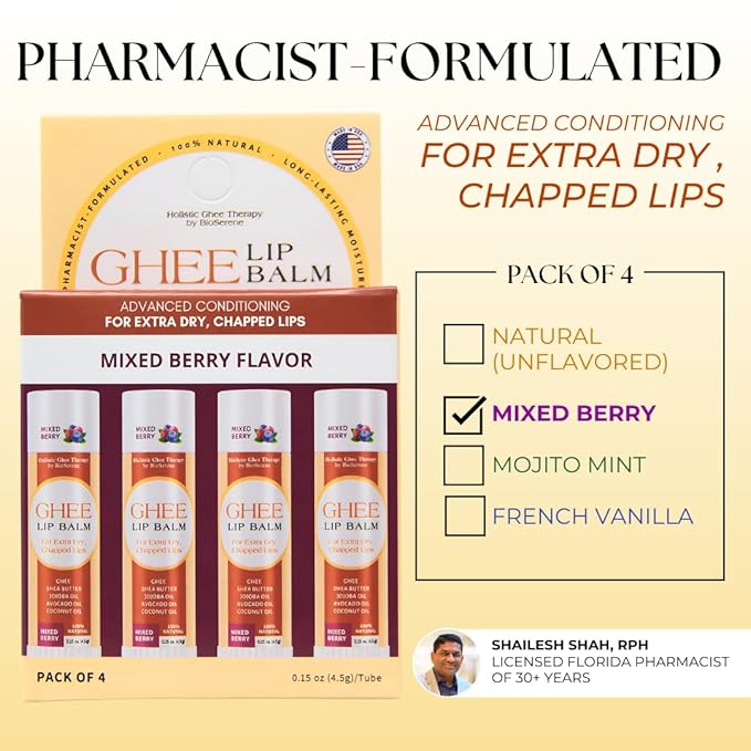 All Natural Lip Balm For Very Dry Lips | Hydrating & Moisturizing Lip Balm with Shea Butter, Ghee, Jojoba Oil, Coconut Oil | Chapped Lips & After Sun Care | BioSerene (4.5 gms/tube, Mixed Berry)